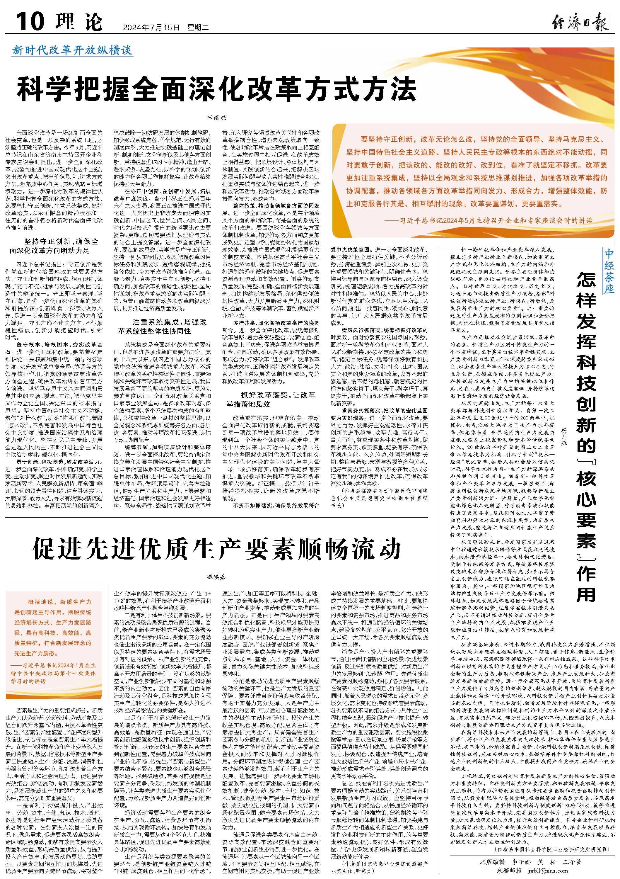 整体施策,推动各领域各方面协同发展。进一步全面深化改革,不是某个领域某个方面的单项改革,而是全面的系统的改革和改进。要围绕深化各领域各方面体制机制改革,加快推动各方面制度更加成熟更加定型,将制度优势转化为国家治理效能,为推进中国式现代化提供更有力的制度支撑。围绕构建高水平社会主义市场经济体制,完善市场经济基础制度,打通制约经济循环的关键堵点,促进要素资源合理流动和高效配置。围绕推动高质量发展,完整、准确、全面贯彻新发展理念,加快构建新发展格局,深化供给侧结构性改革,大力发展新质生产力,深化财税、金融、科技等体制改革,蓄势赋能新产业新业态。